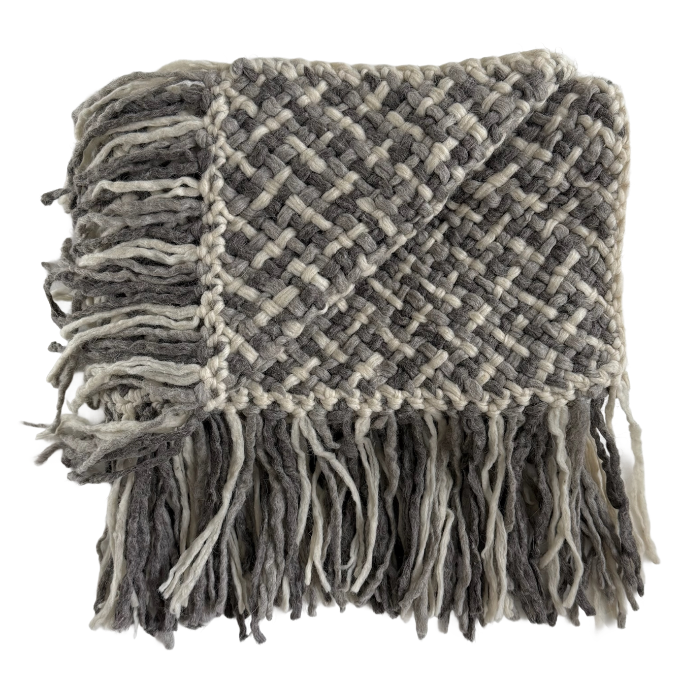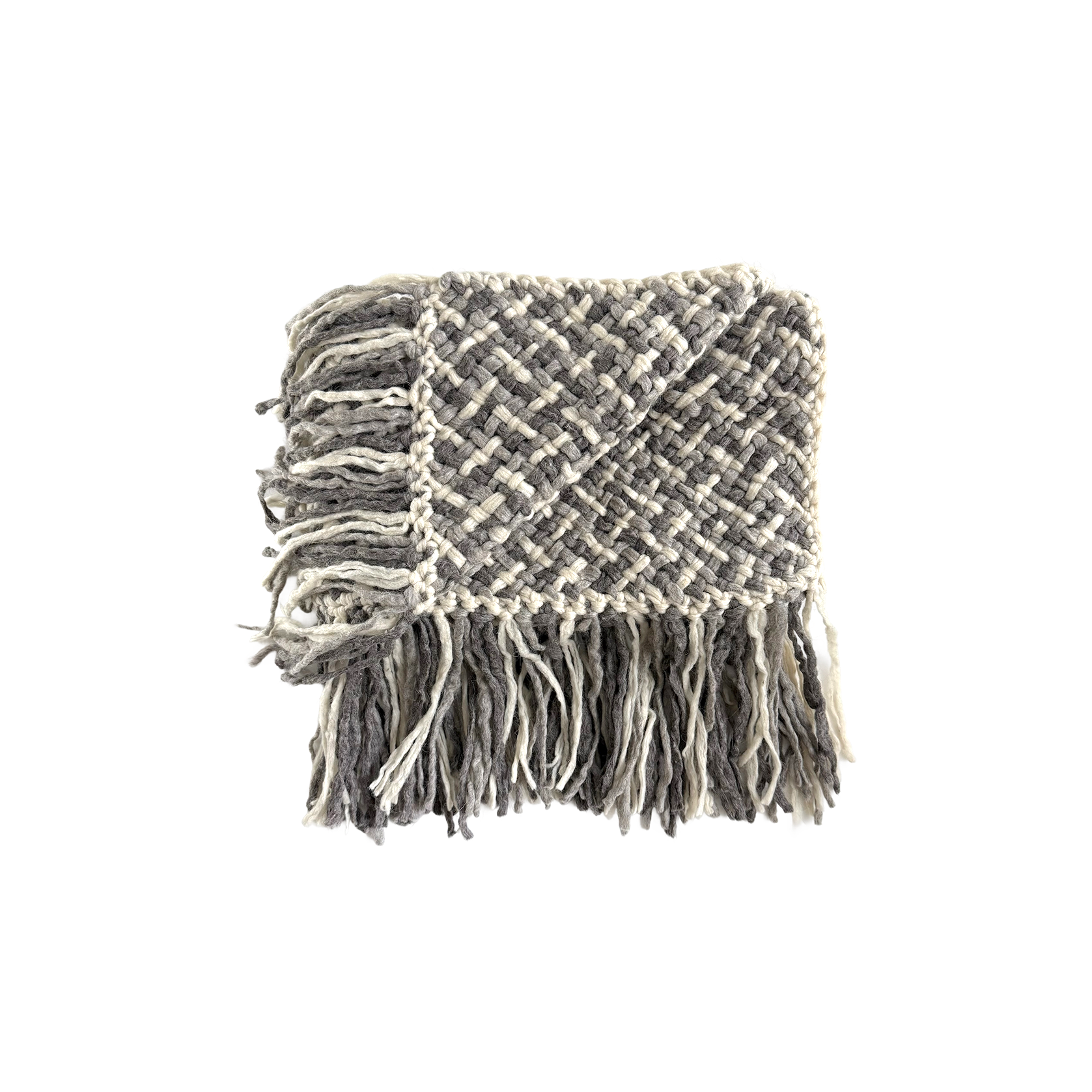 A throw handwoven from double threads, featuring fringes and a blend of grey and natural tones. Its simple yet stylish design brings warmth and texture to your space, or adds a cosy layer when draped over your shoulders.