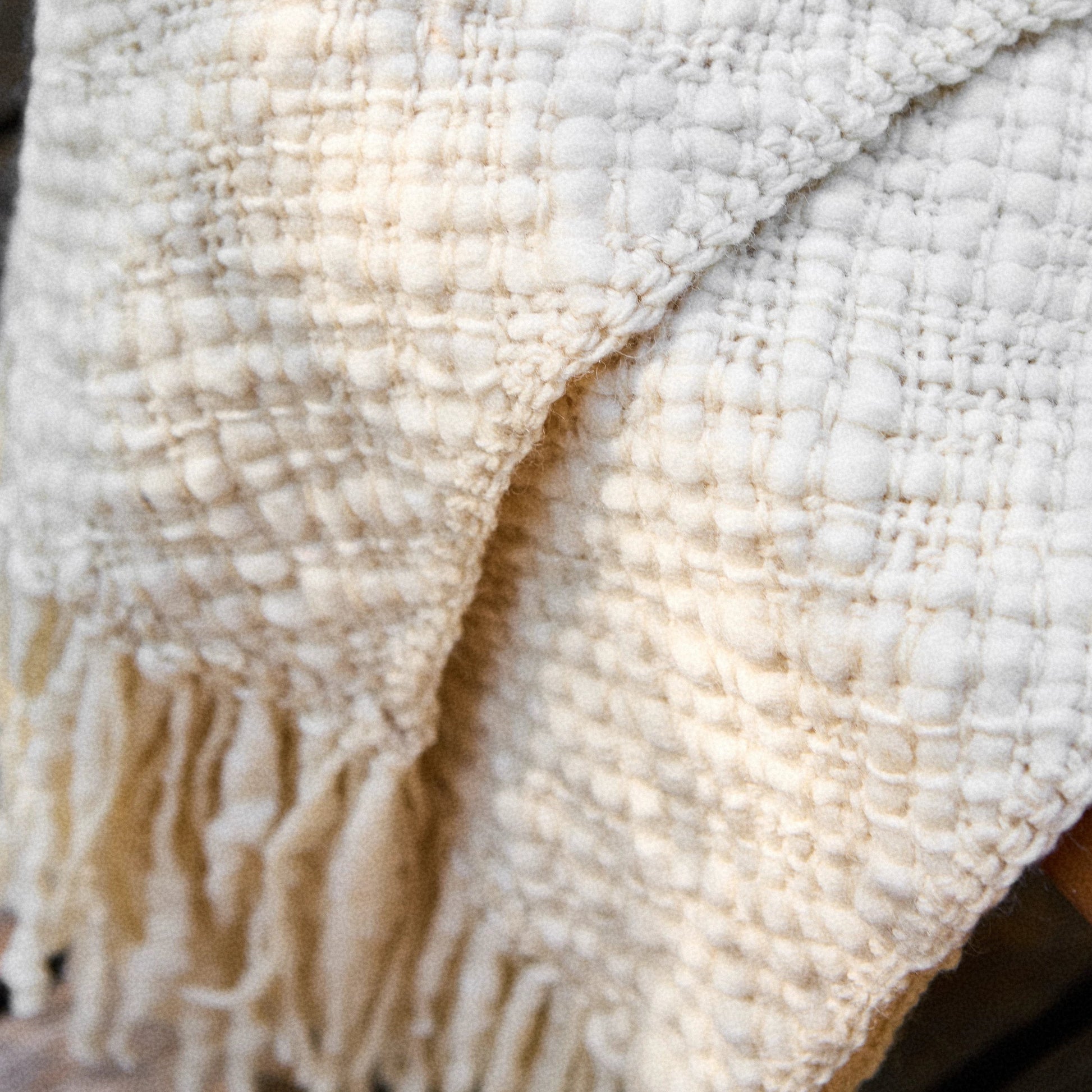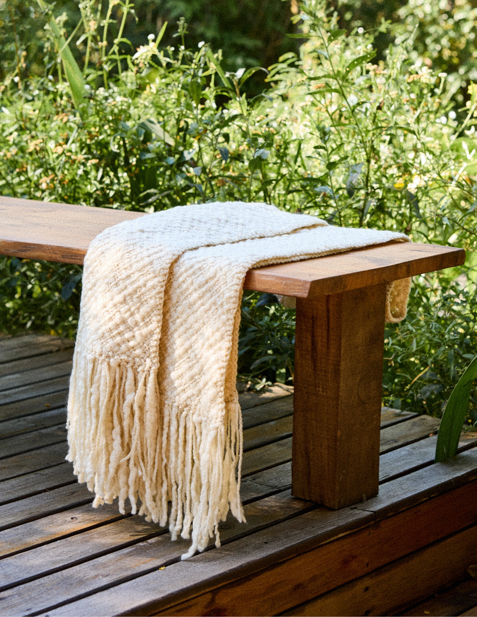 A throw handwoven from fine sheep wool threads, featuring natural fringes and crafted in its pure, natural colour. Perfect for draping over your bed, using as a cosy throw, or wrapping over your shoulders for warmth and style.