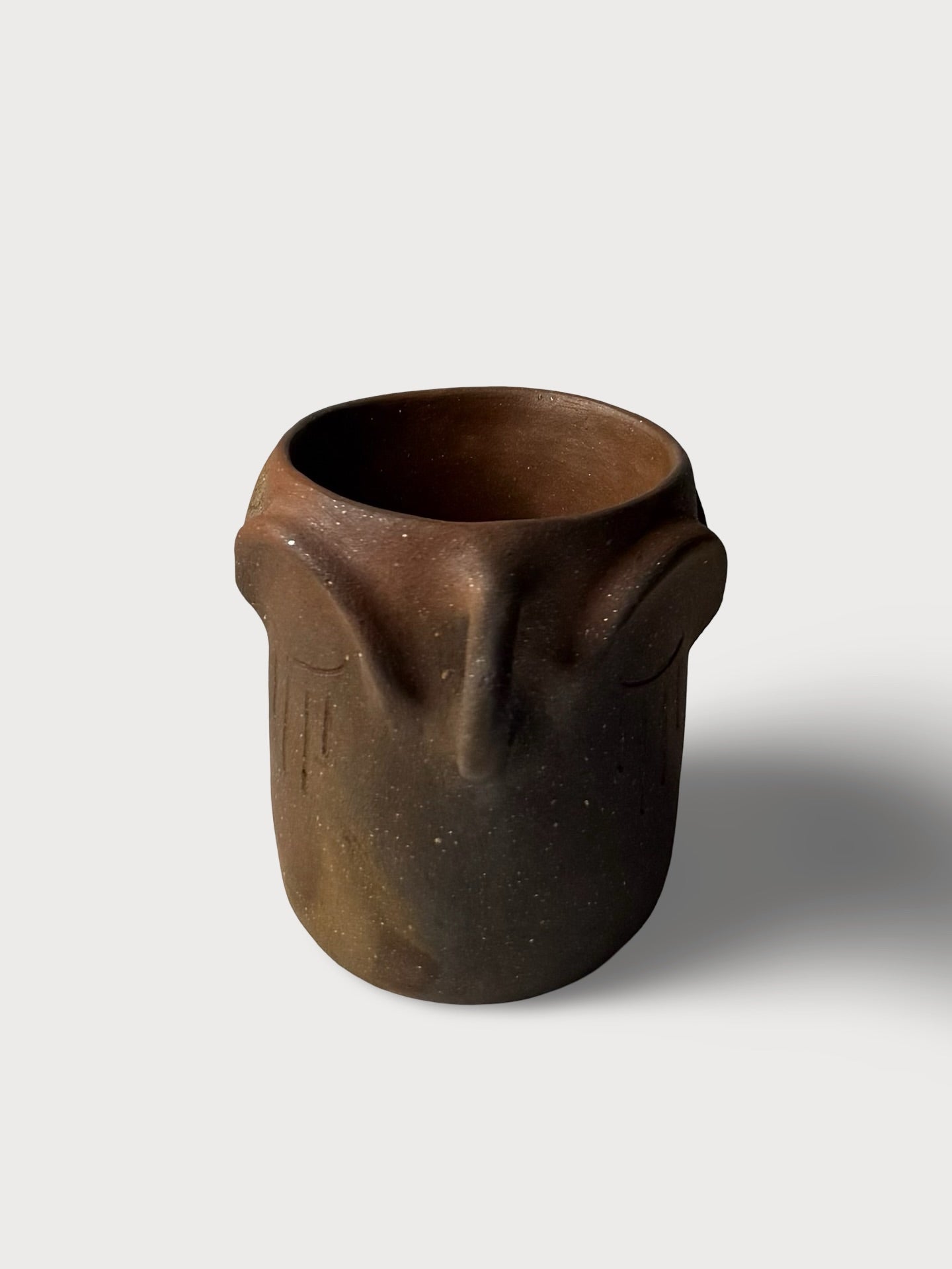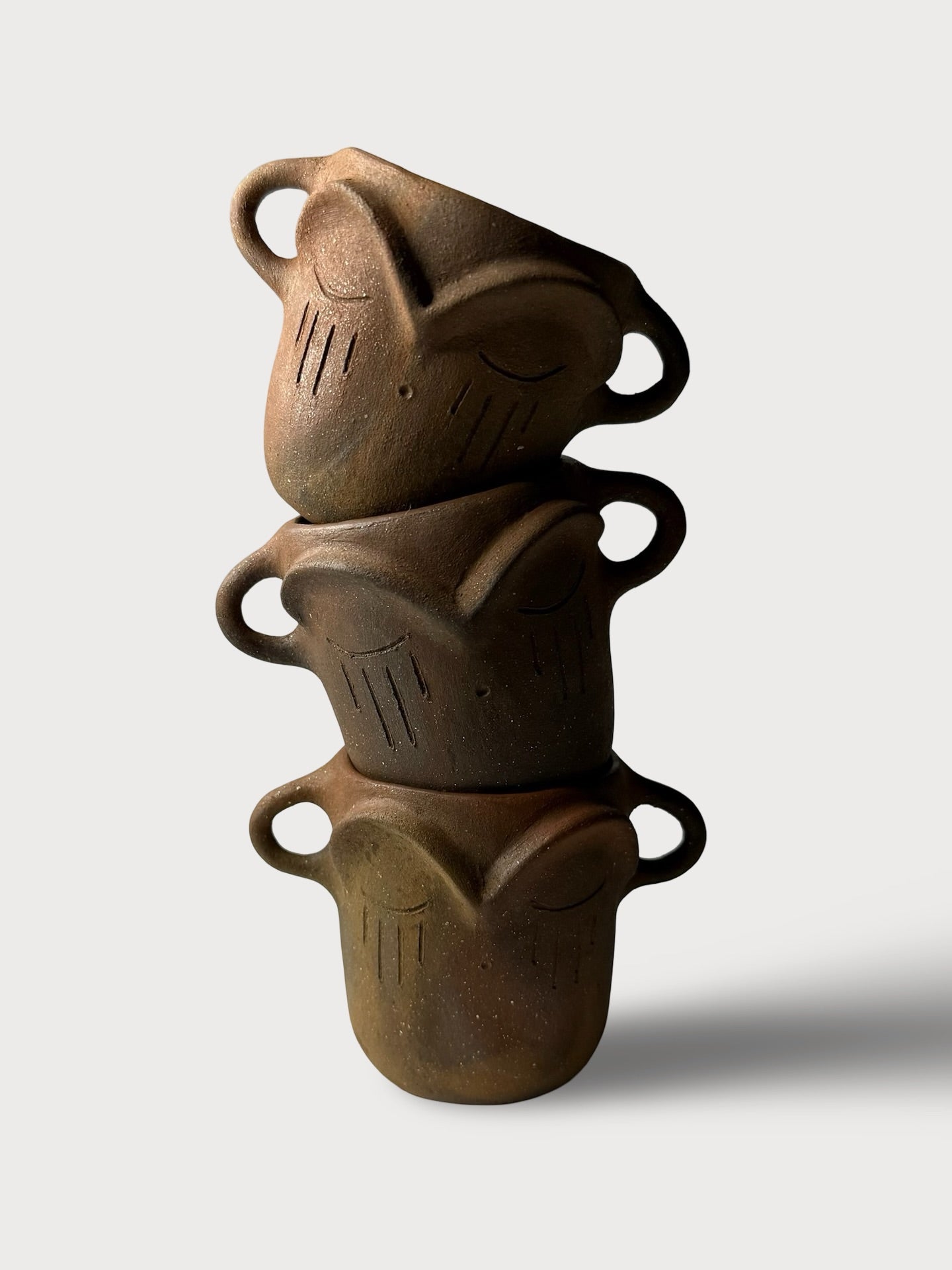 This unique handcrafted mug features a striking crying face design and double handles. Intended for decorative use, it adds character and artistry to any space.