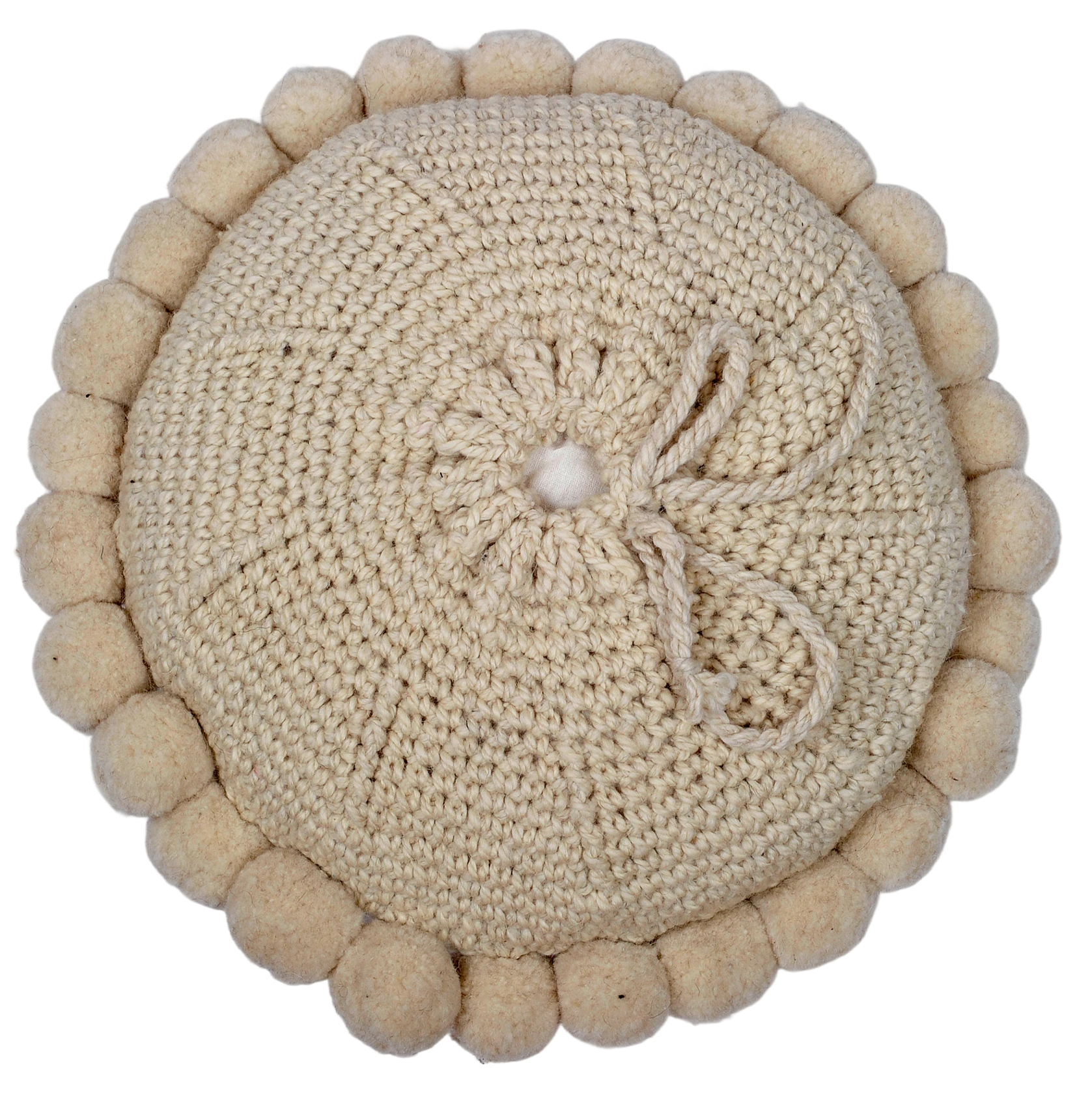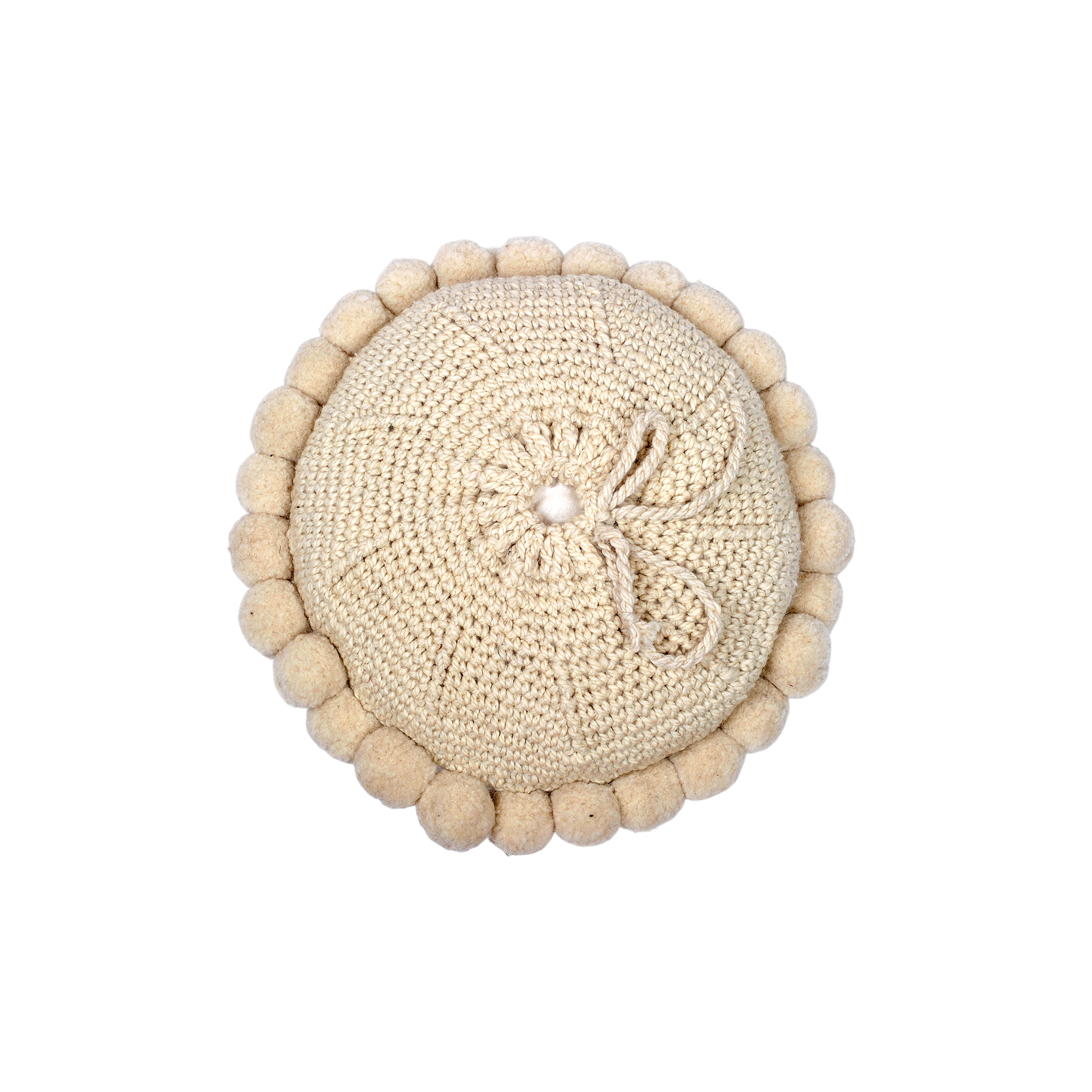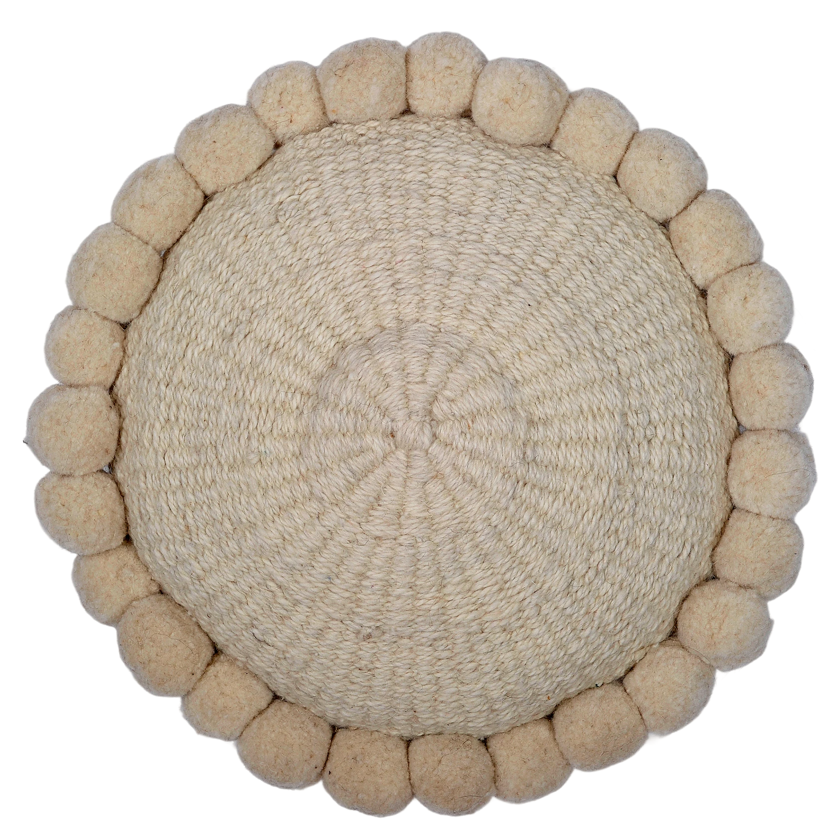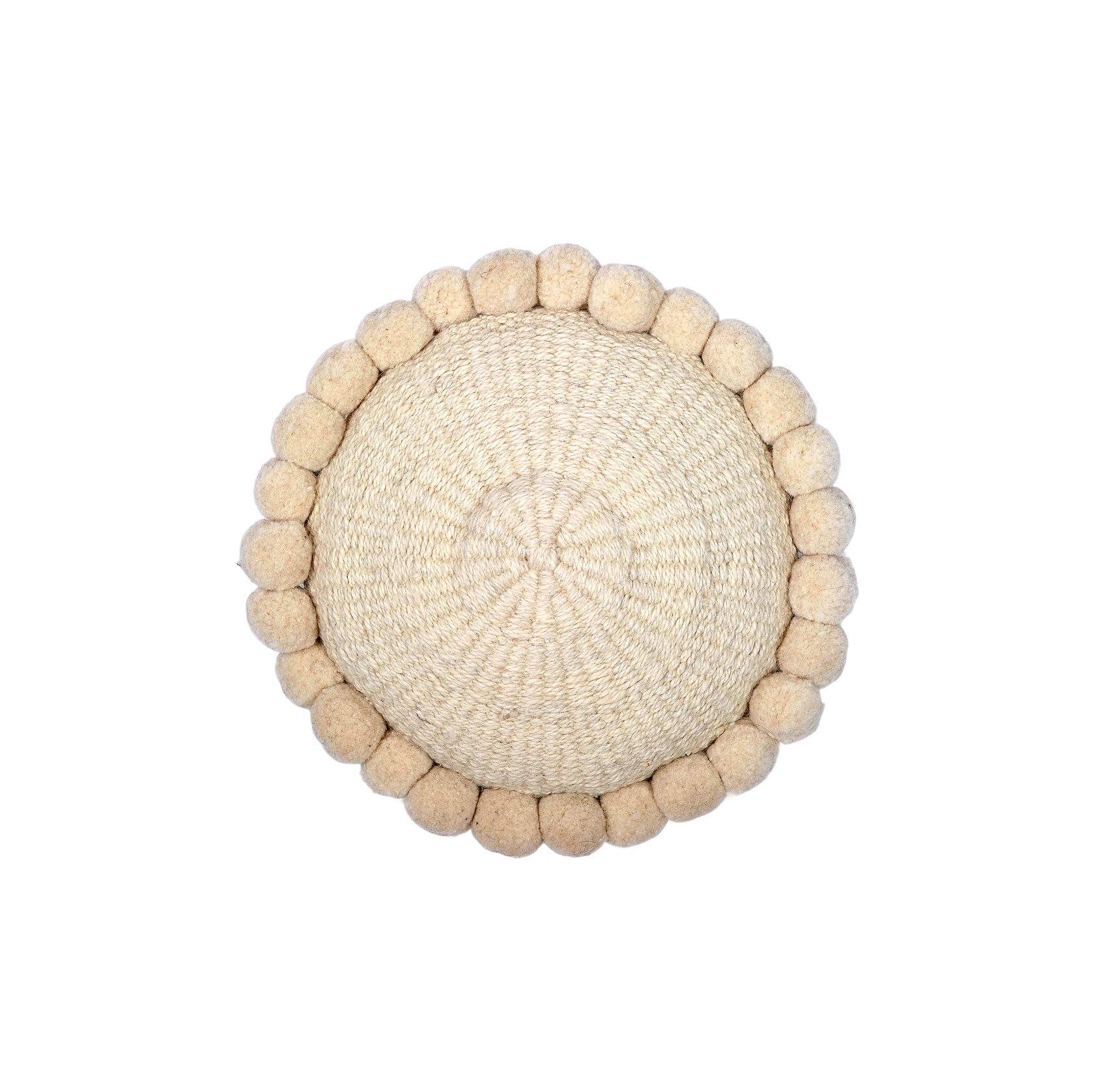 A round cushion cover featuring a central eye design, with pom-poms delicately adorning the outer edge—adding a touch of charm and texture to your space.