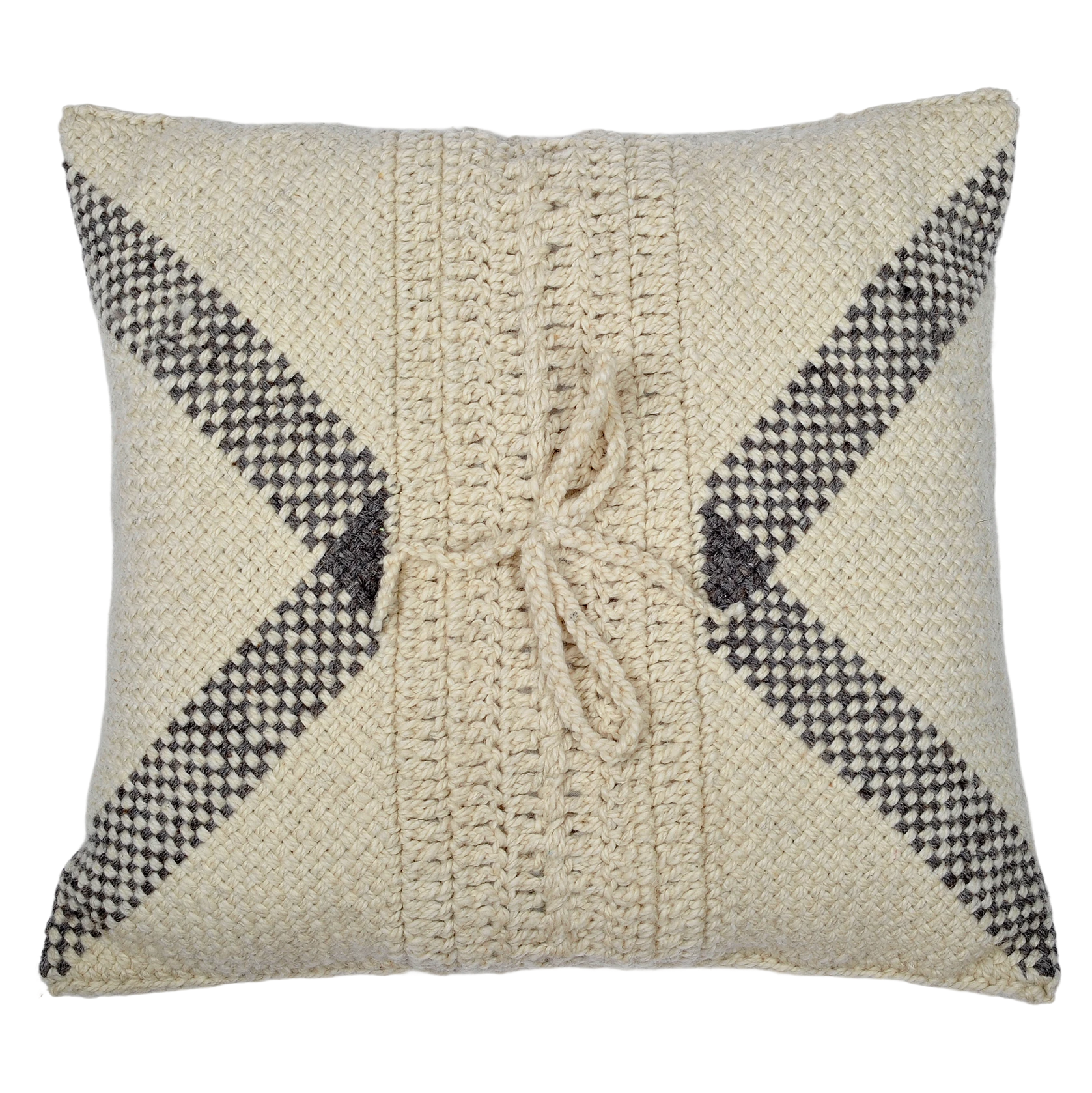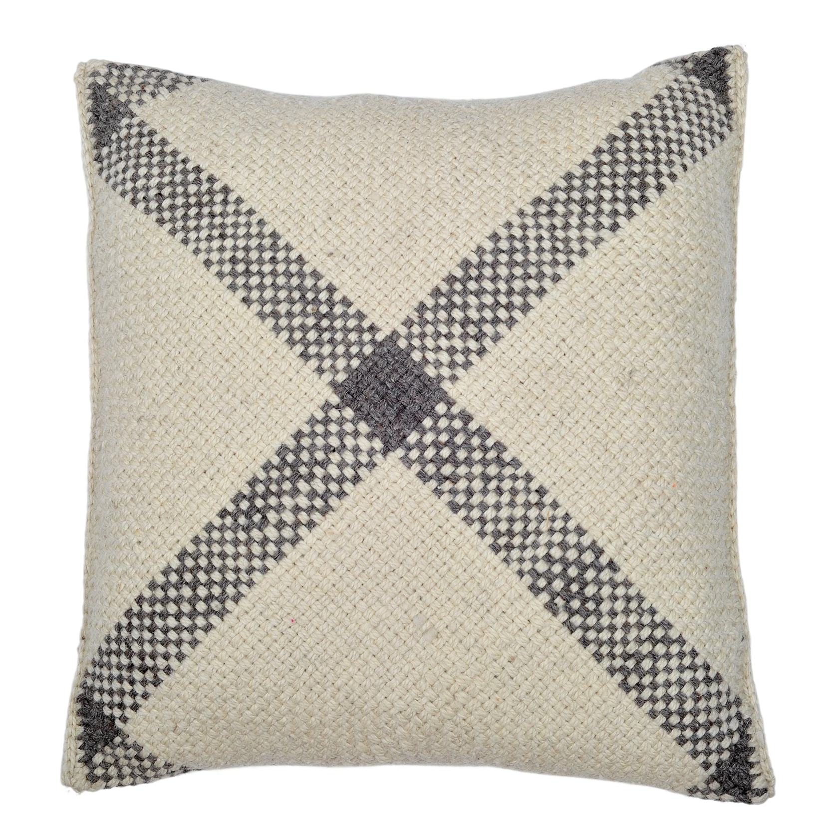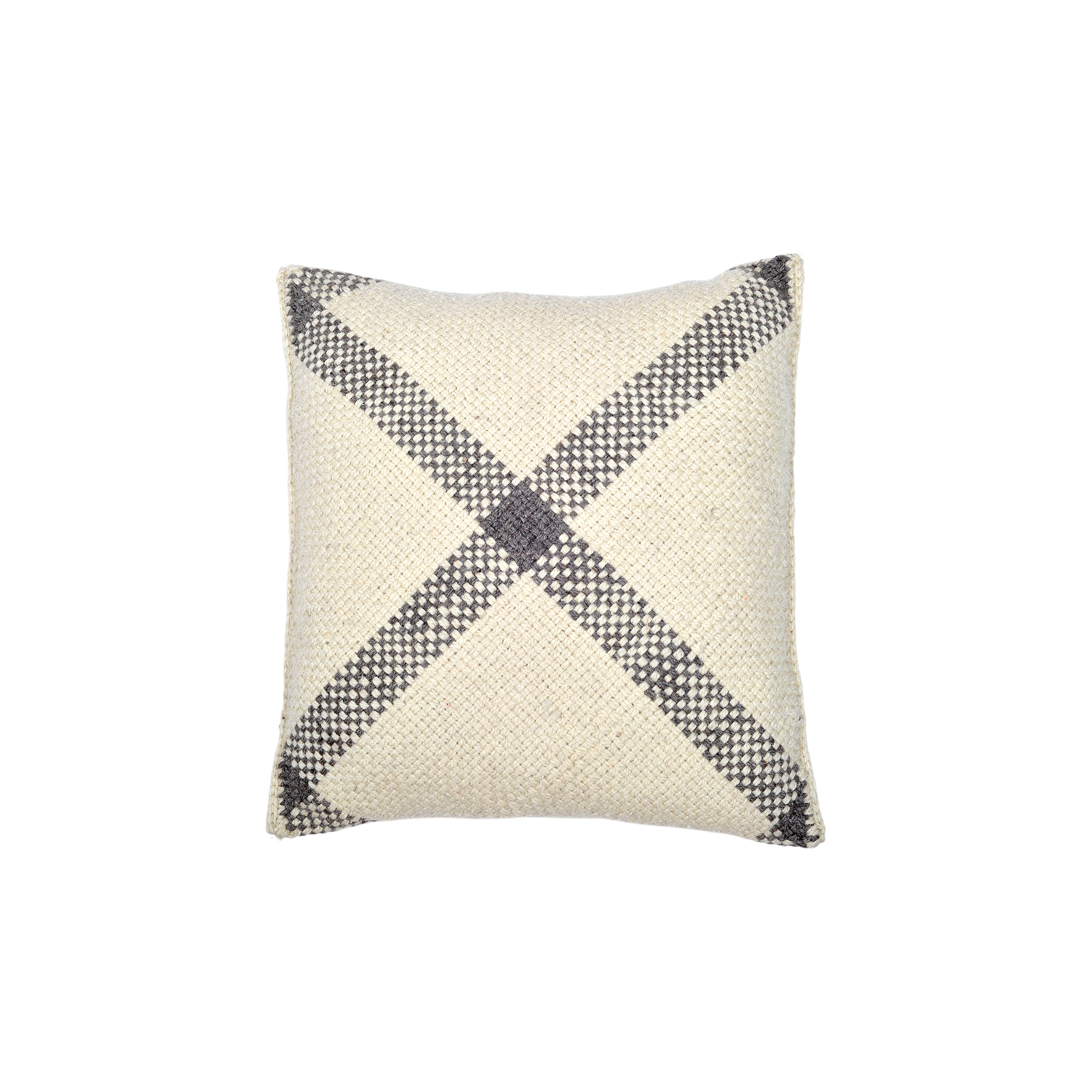 A cushion cover with a simple weave, featuring a handcrafted closure and a subtle grey cross design—adding a clean, modern touch to any space.