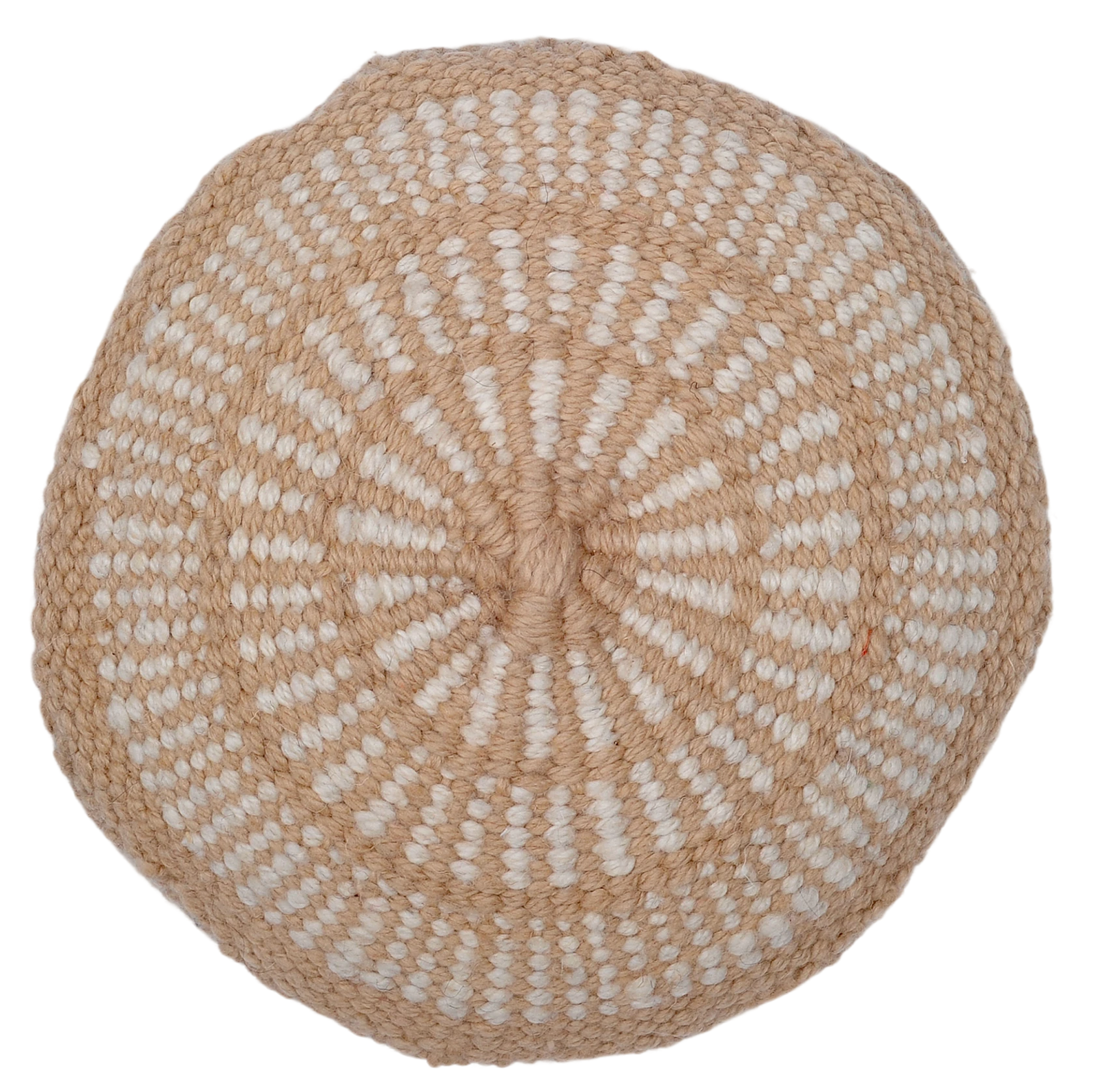 A round cushion cover in a soft tea colour, featuring a central eye design and delicate natural-coloured stitched rings—adding warmth and texture to any room.