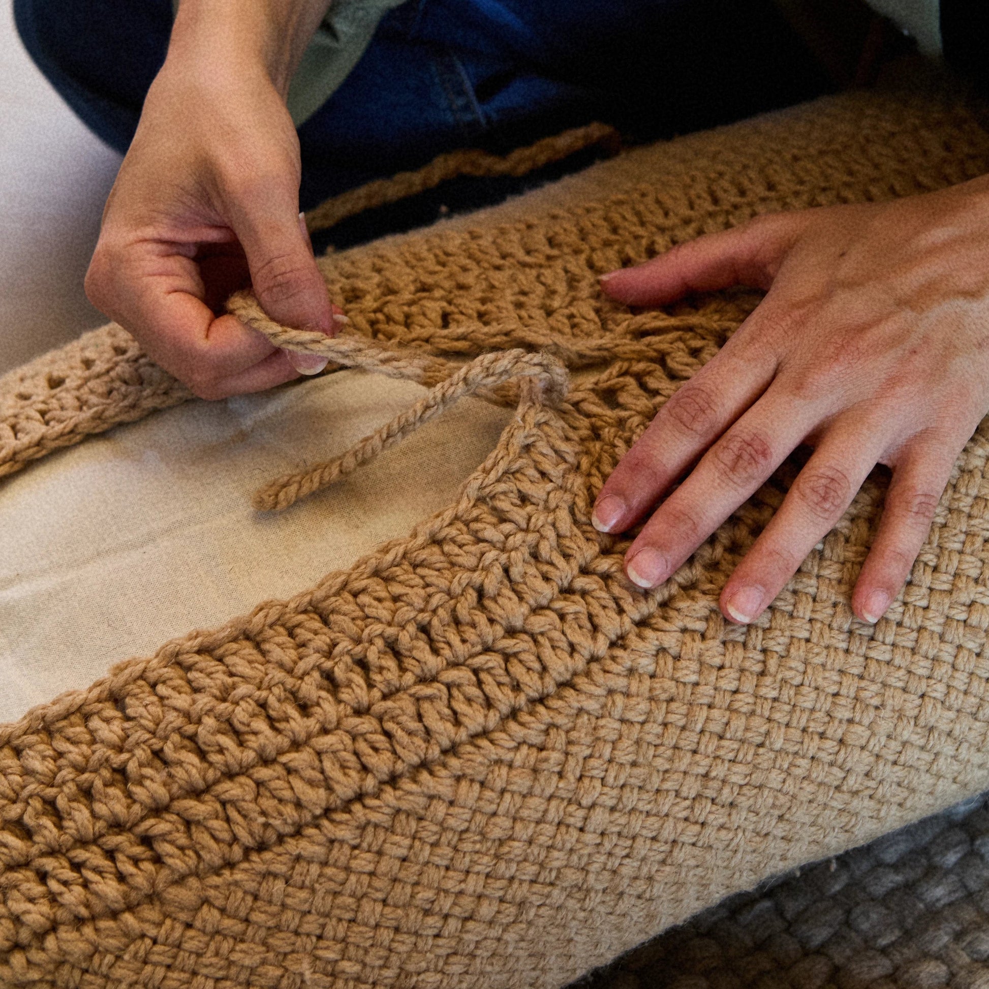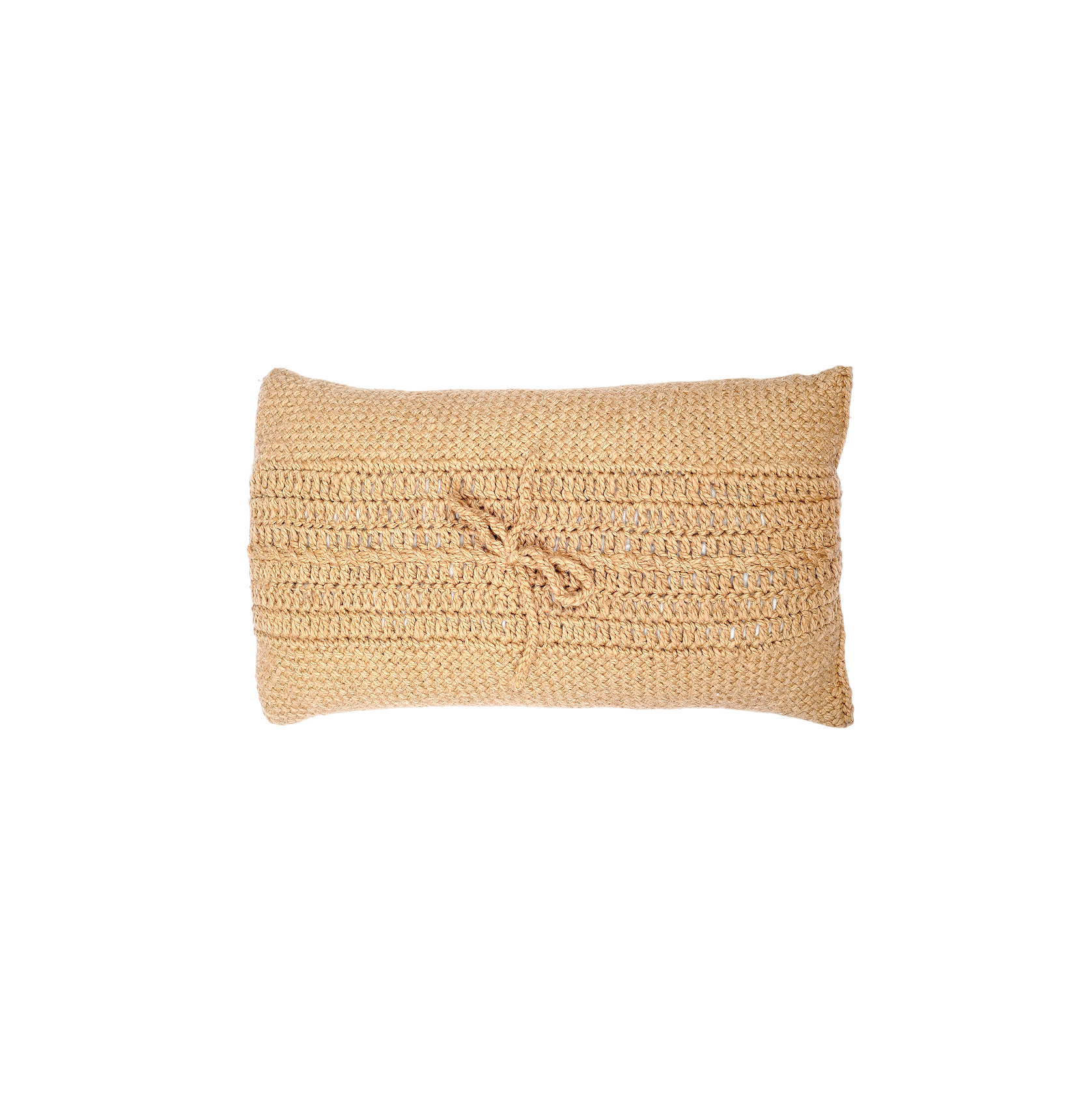 A rectangular cushion with a simple weave, finished with a handcrafted closure—simple, elegant, and versatile for any room.