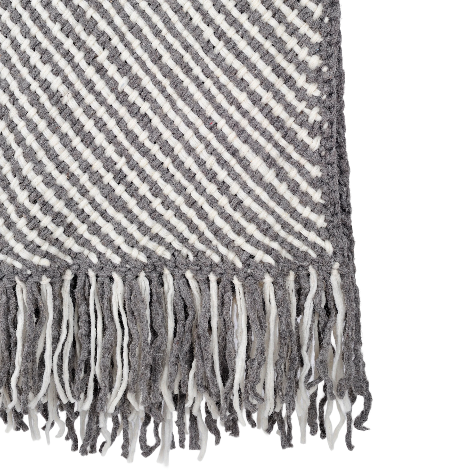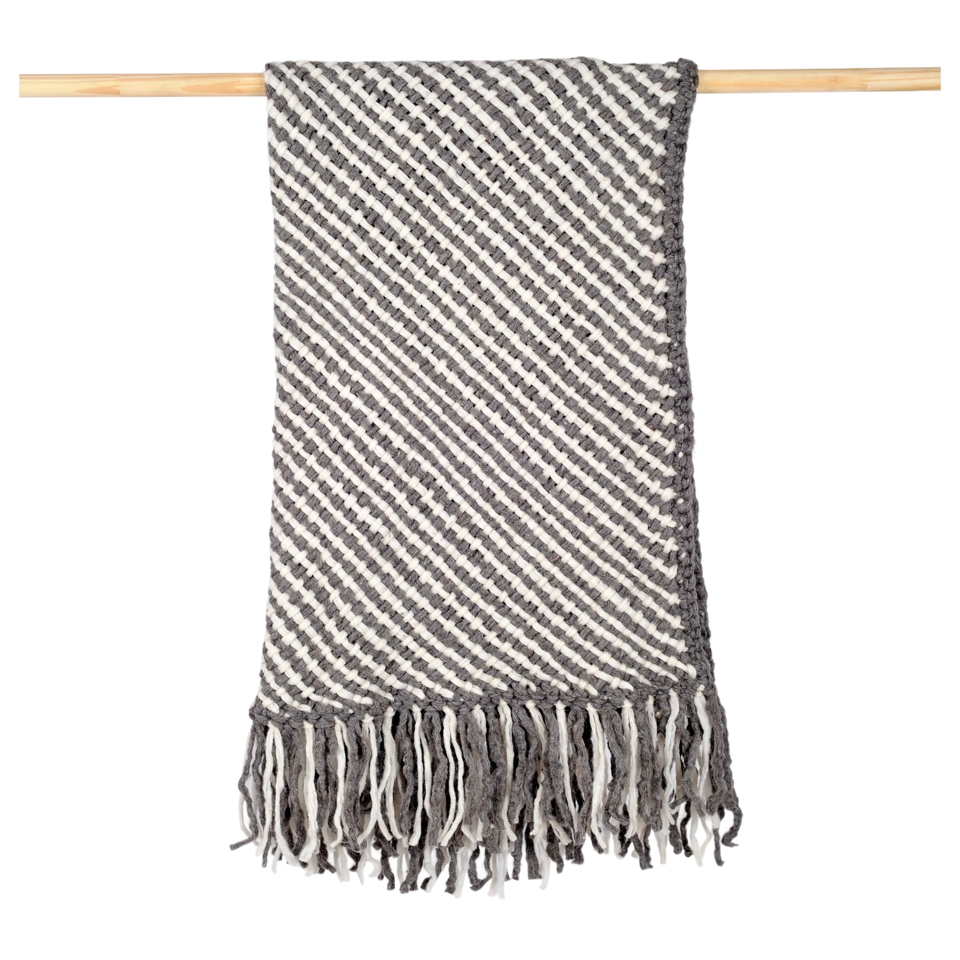 A throw handwoven from double threads, featuring fringes and a blend of grey and natural tones. Its simple yet stylish design adds warmth and texture to your space, or can be draped over your shoulders for a touch of comfort and elegance.