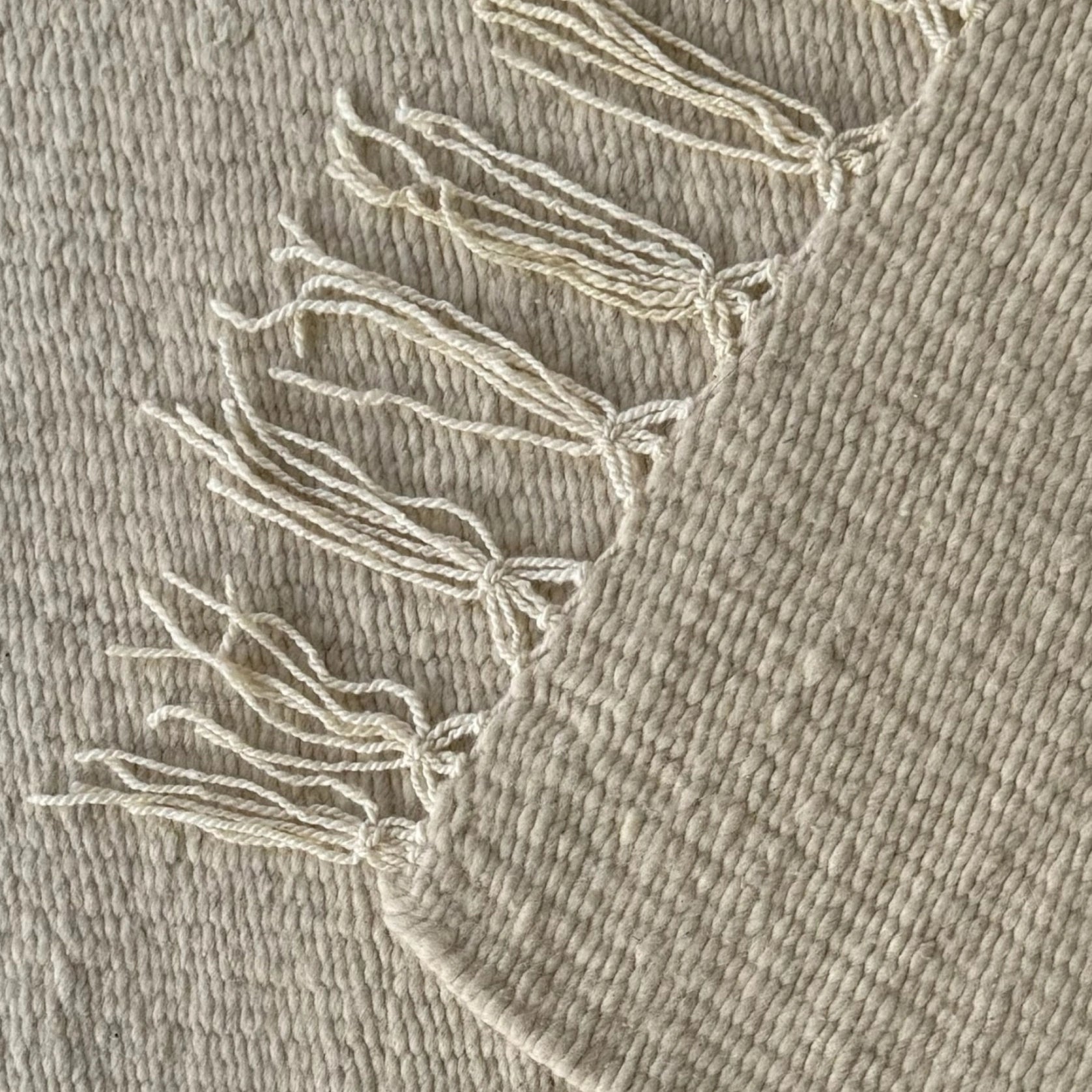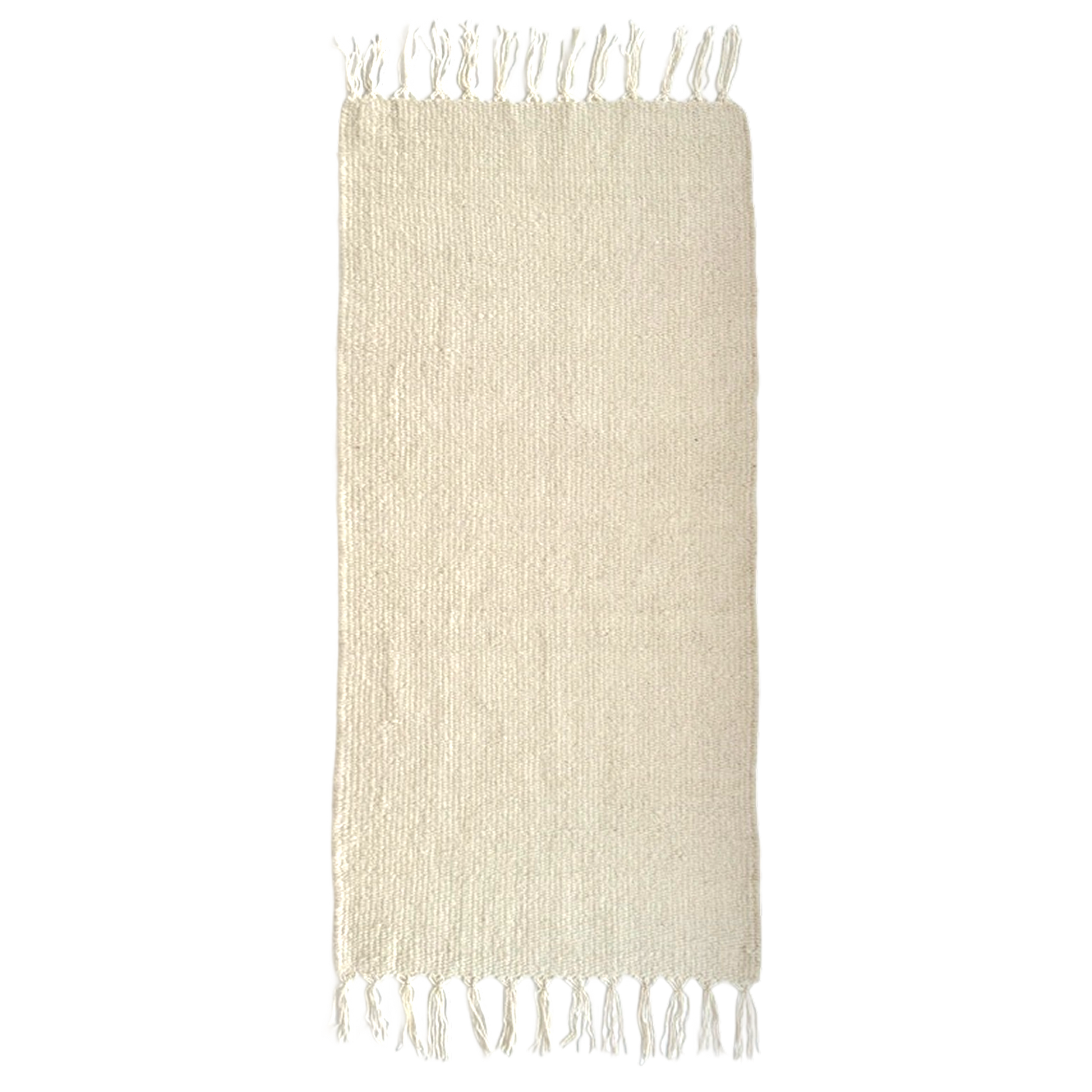 A woven bed end or bedroom rug, complete with fringes, adding texture and a touch of elegance to your room with its handcrafted design.