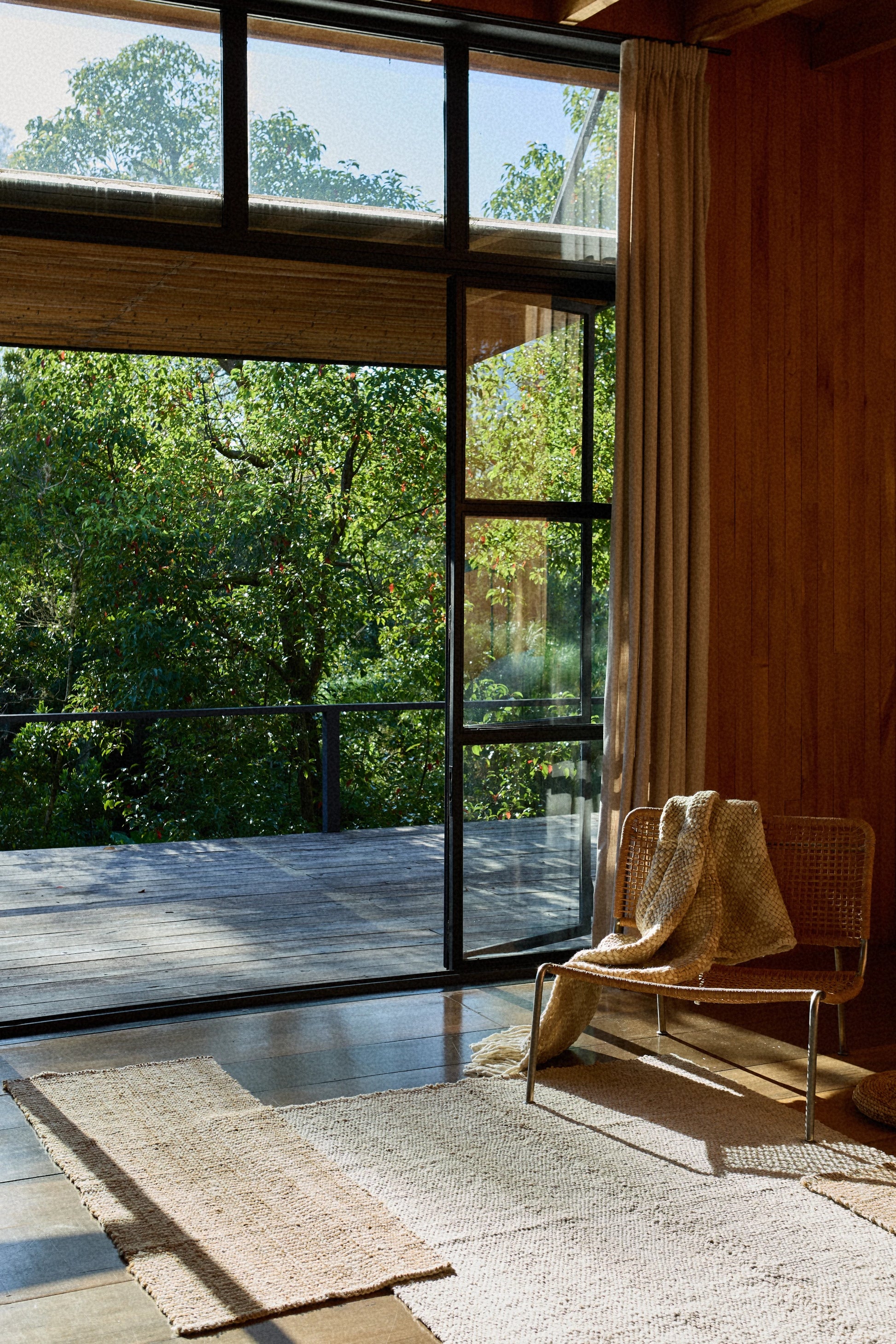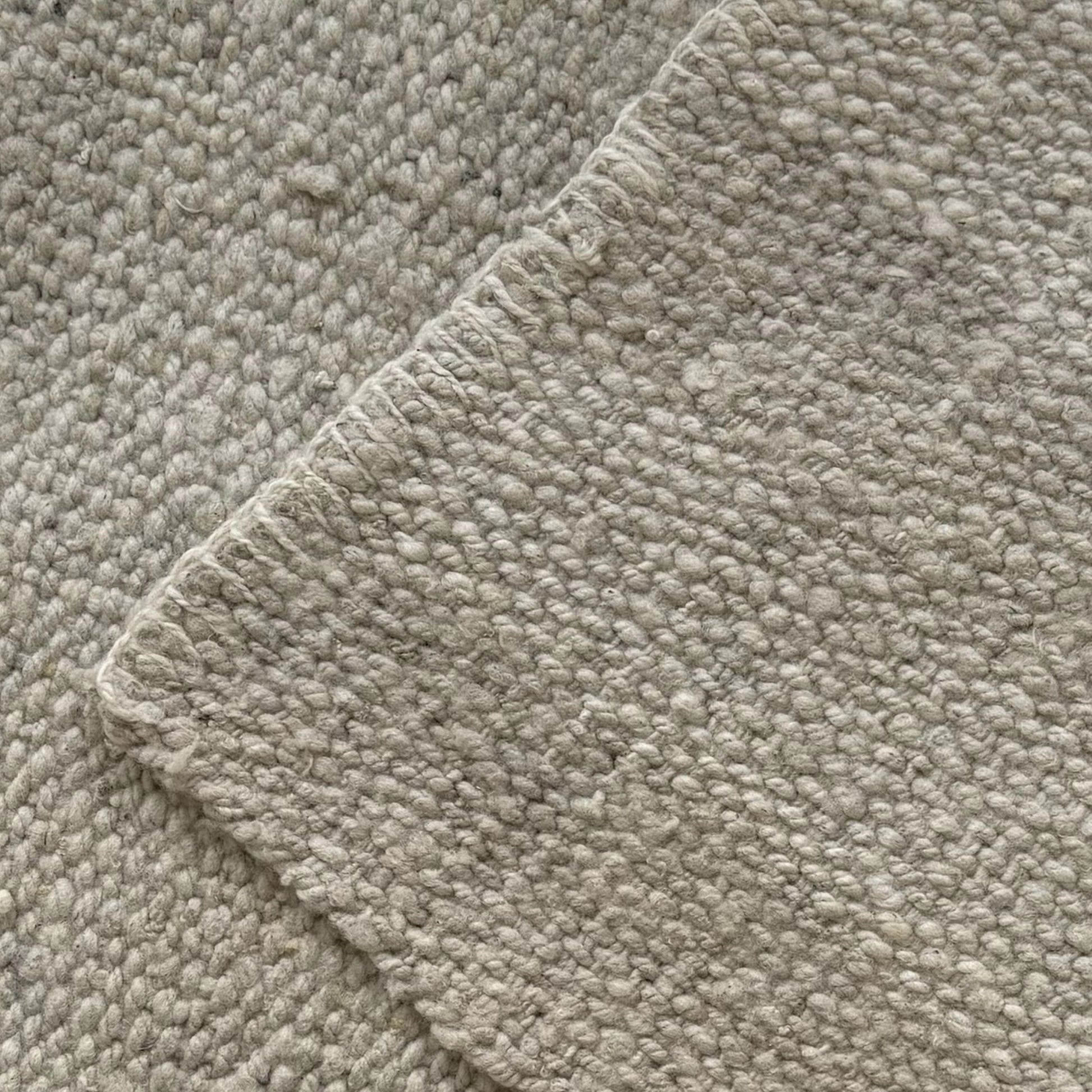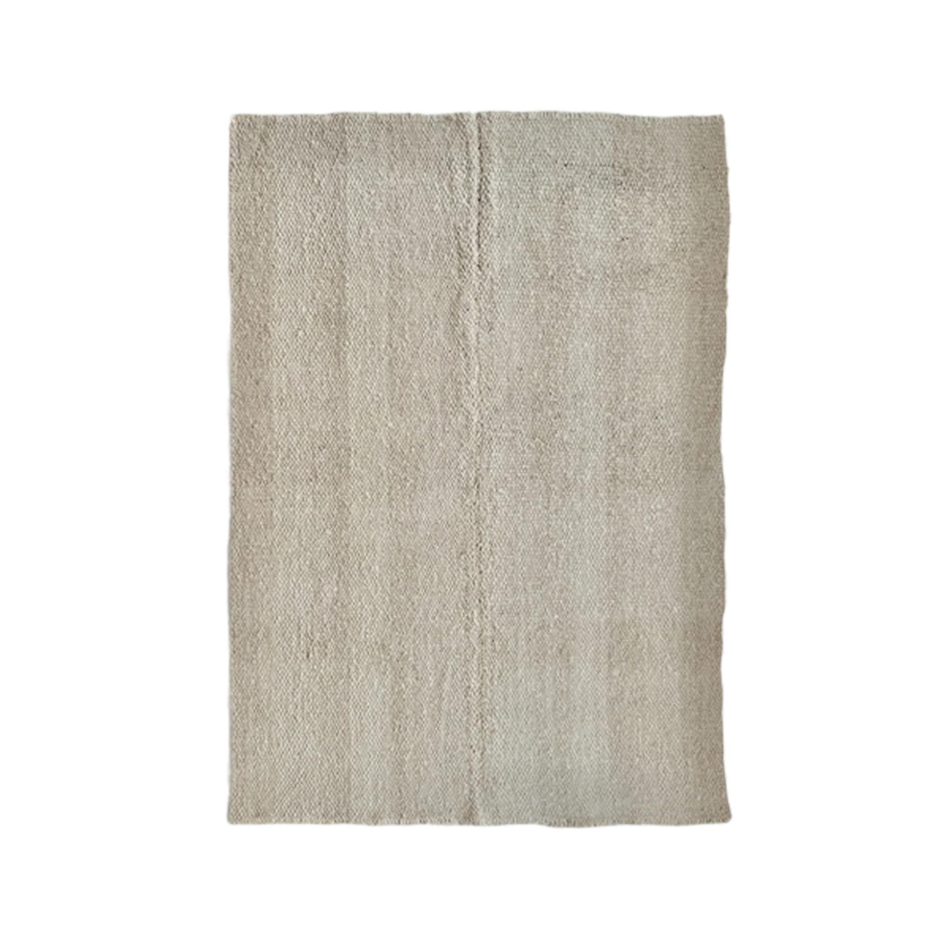 A handmade rug crafted from natural sheep wool using the warp thread technique. The weave is intentionally loose, allowing the pattern to be visible and adding a unique, textured look to the piece.